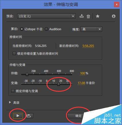 3、這里需要調(diào)整變調(diào)項(xiàng),伸縮是用來調(diào)整速度的。變調(diào)值越高則聲音越尖銳,似女聲,反之側(cè)似男聲。
