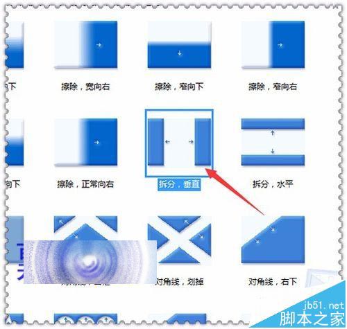 1、在這個(gè)軟件里面先來看一下它默認(rèn)圖片。在這個(gè)軟件的界面中,可以隨意的導(dǎo)入圖片,也可以直接在它的收藏后面點(diǎn)擊它的下拉小按鈕。先選擇視頻過渡的效果。這里就選擇拆分,垂直的過渡效果。