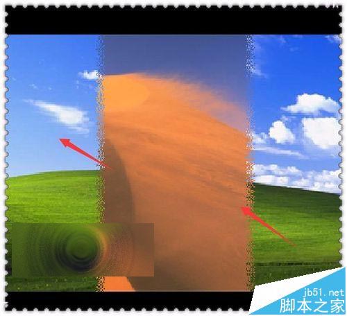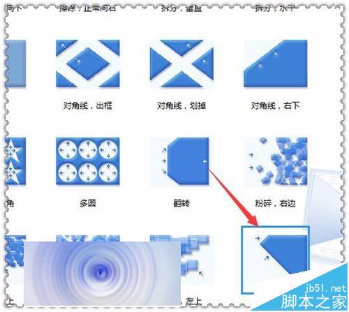 9、在這里也是用的是和開始的時(shí)候預(yù)覽的方法是一樣的。點(diǎn)擊收藏上面的過渡效果。這次選擇一個(gè)流滾動(dòng)。在預(yù)覽窗口中點(diǎn)擊一下播放就可以看到,現(xiàn)在的這兩張圖片正是我們之前進(jìn)行替換的兩張。