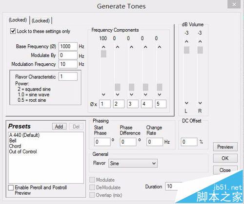 3、選擇Tones后會彈出一個新對話框,左上角可以勾選表示鎖定這些設置,先介紹勾選的情況,此時只能設置當前所看到的,Base Frequence可設置你想要的頻率,通常情況下可調節dB音量,以及播放時間duration。Flavor選擇sine或者其它都可。測試單頻通常選擇sine。