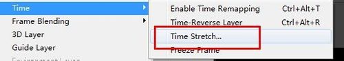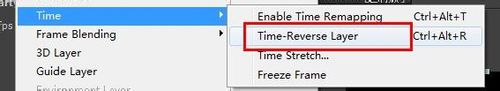 3、使用菜單選項中的“time”-“time-reverse layer”功能,可以使視頻的時序反轉,視頻將倒著播放