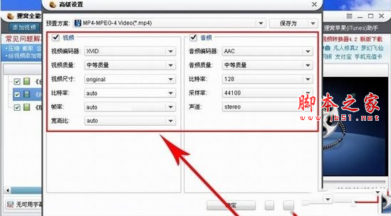 3、選擇“預(yù)置方案”后面的高級(jí)設(shè)置,可以對(duì)視頻的參數(shù)進(jìn)行設(shè)置。可根據(jù)您的需求選擇合適的視頻參數(shù);如輸出視頻編碼器、質(zhì)量、尺寸、比特率、幀率、比例、音頻采樣率、聲道等。