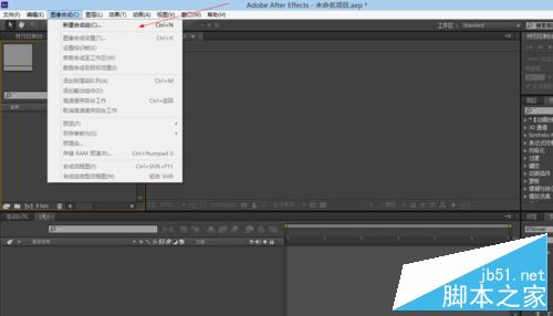 1、首先打開軟件界面如下,然后找到“圖像合成 這個選項,或者直接用快捷鍵Ctrl+N,會出現一個對話框,那里可以打項目的名稱,還可以設置像素、分辨率、還有時間碼等等的設置