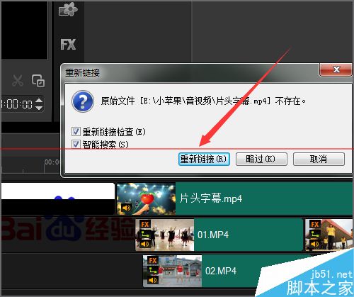 2、在顯示黑色和白色條上,它可能還有這樣一個提示:原始文件不存在。這時候可以看到在它下面還有一個重新鏈接檢查和一個智能搜索,它都是默認的打上勾的。出現黑色的白色的條是因為素材并沒有成功鏈接。這時候,我們點擊下面的重新鏈接。