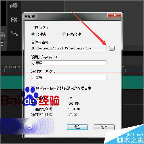 12、點擊智能包之后,它會彈出一個提示的面板,是否要保存當前的項目我們點擊是。接著它會彈出一個智能包的面板??梢钥吹皆谒虬?,有兩個選項。一個是所打包的文件以文件夾的形式保存,一個是以壓縮文件的方式保存。這里就選擇它默認的文件夾。在文件夾的路徑中,它默認的是保存到d盤的文檔中。如果想要更改它的路徑的話,點擊后面的方框進行選擇。選擇好之后點擊確定。