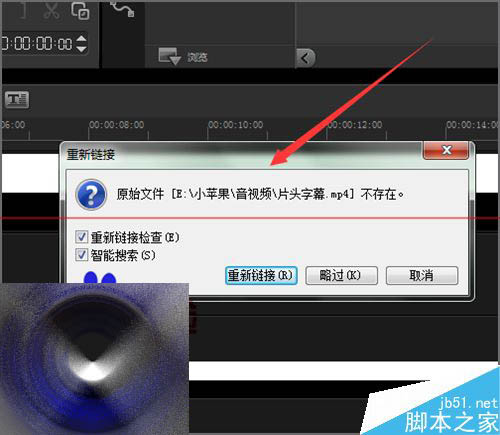 7、我們在它沒有成功鏈接的素材上進行一個點擊,就會彈出一個提示框:在e盤中小蘋果/音視頻/片頭字幕.mp4不存在。我們知道我們所下載的模板素材中有這個片頭字幕的視頻文件。所以我們需要再次的進行一個重新的鏈接。