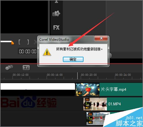 9、打開之后,在它彈出的提示面板中就可以看到,所有的素材已經被成功的重新鏈接。然后點擊確定。這時候,在軟件的界面中就可以看到我們所有的模板素材都已經被成功的進行了一個導入。