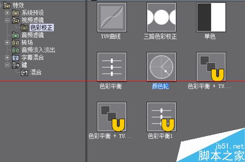1、edius自帶的色彩控制特效主要有五個,分別是YUV曲線、三路色彩校正、單色、色彩平衡和顏色輪。其中單色不經常使用,此處重點講其他四個色彩校正特效。