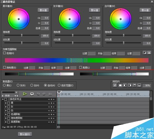 3、三路色彩校正。如圖所示三路色彩矯正主要用于黑白灰平衡的調節。三個色環和中間的點分別用于控制畫面中黑白灰三種色調的值。