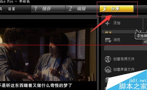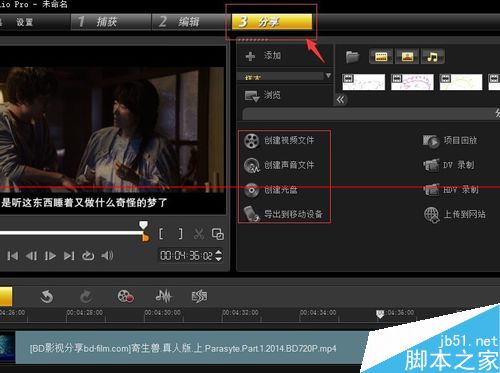 3、在分享界面我們主要是使用左側的紅色方框里面的選項,創(chuàng)建視頻文件就是輸出視頻,創(chuàng)建聲音文件就是輸出音樂,創(chuàng)建光盤就是刻錄光盤,還可以通過導入到移動設備導入到自己的移動硬盤。
