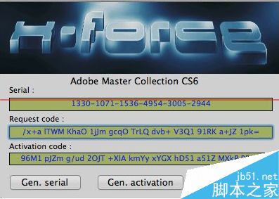 3)管理員身份運行注冊機,打開注冊機后,在Serial里面填入剛才安裝Adobe premiere CS6時填入的序列號,然后將剛才復制的請求碼粘貼到Request code里面