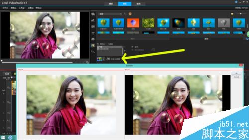 3、單擊一個濾鏡圖標(biāo)就可以在左邊的看到效果簡圖。此處選擇應(yīng)用"氣泡",單擊不放并拖動“氣泡”濾鏡圖標(biāo)到素材圖片上,再次單機素材圖片,再在預(yù)覽窗口點擊播放可以查看效果。