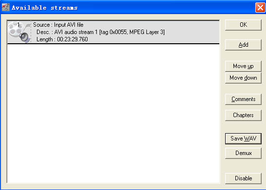 file---open video file(導(dǎo)入無聲avi),streams——stream list ,add(添加聲音文件),file--save as,就能合成影音了。