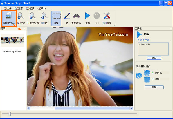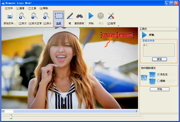 3、“選擇”在有臺標水印的地方,圈選水印,界面右邊工作欄中,可瀏覽輸出路徑、還有物體刪除模式(變色龍、模糊),然后就可以點擊“開始”吧。