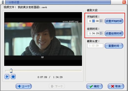 步驟三:在文件列表中,選中需要截取片段的視頻,點擊窗口右邊的“分割設置”按鈕,進入“分割設置”窗口,可以直接修改開始時間和結束時間,也可以播放預覽到需要截取的部分,點擊“設置開始時間”按鈕來讀取當前預覽時間作為開始時間。點擊“上一個”、“下一個”可以對所有添加進去的視頻依次設置,設置好后點擊確定按鈕即可;