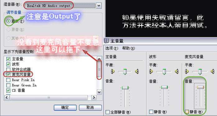 如上圖所示在錄音(Audio input)中選擇立體聲混音,并如下圖所示在播放(Audio output)中把麥克風音量的靜音去掉。