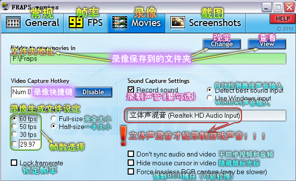 聲音問題搞定之后,開始FRAPS設置(如下圖)。看仔細了,有其它問題請留言。