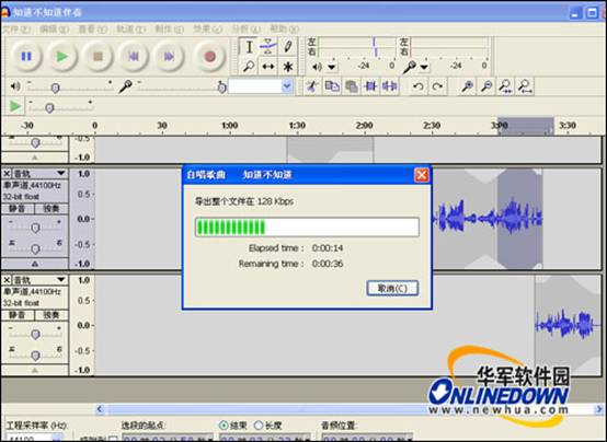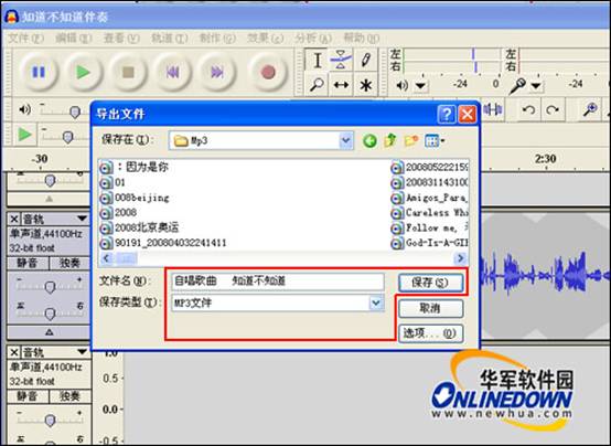 調(diào)整到你滿意以后,就可以把你錄制的歌曲進(jìn)行輸出了;單擊“文件”菜單,選擇“導(dǎo)出”選項(xiàng),彈出導(dǎo)出文件對話框,在此設(shè)置文件的輸出路徑及輸出名稱,選擇保存文件的類型,然后單擊“保存”按鈕即可。如圖12所示。