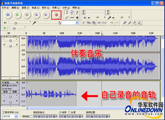 ”錄音按鈕,就可以開始錄歌了;現(xiàn)在只要你開唱就可以了。這時(shí)我們可以看到界面上多出一音軌,就是我們自己唱歌的錄音。如圖5所示。