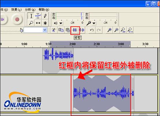 聲音大小調(diào)整完成以后;單擊選擇工具,如果還是調(diào)整大小狀態(tài),很容易再次調(diào)整聲音。如果我們要?jiǎng)h除音頻中的一部分聲音的話,只需選中音頻中要?jiǎng)h除聲音部分,然后按鈕鍵盤上的“Delete”按鈕即可;你也可以選擇要保留的音頻內(nèi)容,然后單擊工具樣上的“修剪”按鈕將選中的音頻文件保留,刪除沒有選取的音頻文件。如圖9所示。