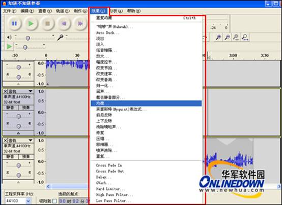 然后在“效果”菜單下為音頻文件添加效果;效果非常的多用戶可以自己動(dòng)手試一下,每種效果都會(huì)給你來不同效果的聽覺效果。選中要添加效果的音頻部分,然后再進(jìn)行效果添加。如圖11所示。