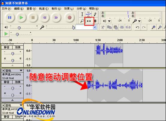 ”時(shí)間移動(dòng)工具來調(diào)整,選擇該工具,然后選中要移動(dòng)的音軌隨意拖動(dòng)就可以調(diào)整位置了。如圖10所示。
