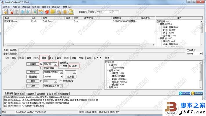 在上圖中,將容器設置為avi,再點擊“畫面”選項卡,參考下圖將視頻設置為最大720x400,并根據比例動態設置高度, 6410支持的最大硬解分辨率了是720x480 30fps,所以不能設置超過這個規格的分辨率: