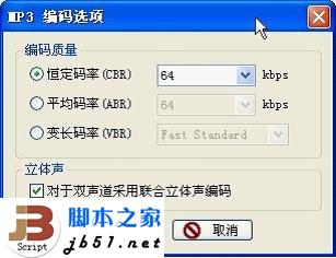 第三:打開“配置”選項卡,在“恒定碼率(CBR)”的下拉菜單中選擇“64”,其他選項不用管, 直接點確定