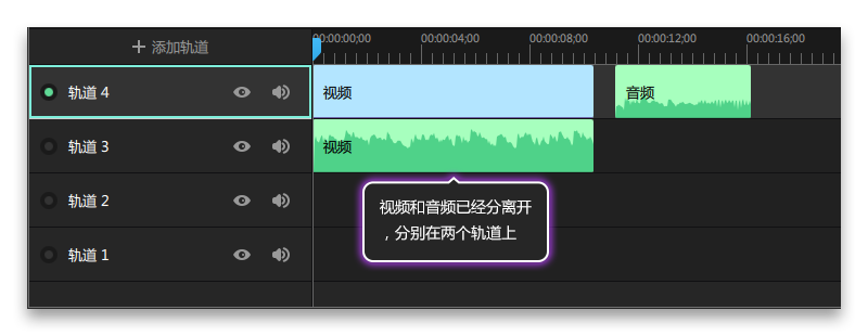 3、可以看到,視頻和音頻已經分離開,分別在兩個軌道上,可以分別進行剪輯,如圖3所示。