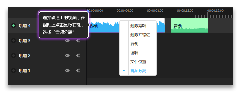 2、選擇軌道上的視頻,在視頻上點擊鼠標右鍵,選擇“音頻分離”,如圖2所示。