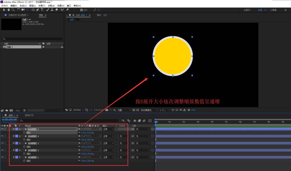 5、選中所有形狀圖層,按S展開縮放效果設置,依次設置縮放百分比數值,讓這個圓呈遞增的百分比縮放。