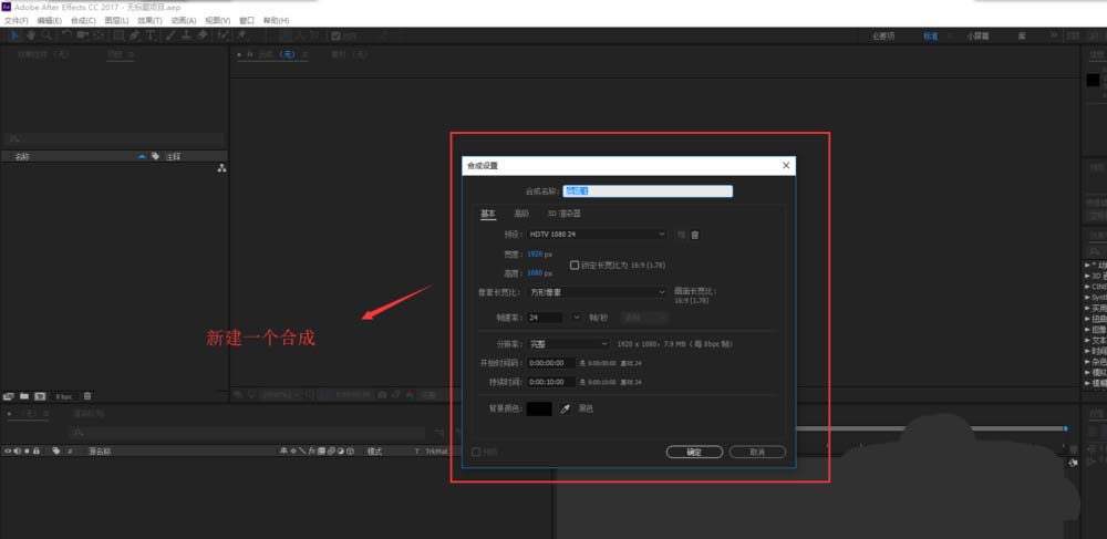 1、在AE中單擊項目窗口下方的新建合成按鈕,彈出合成設置窗口,設置該合成的相關參數,點擊確定創建一個合成。