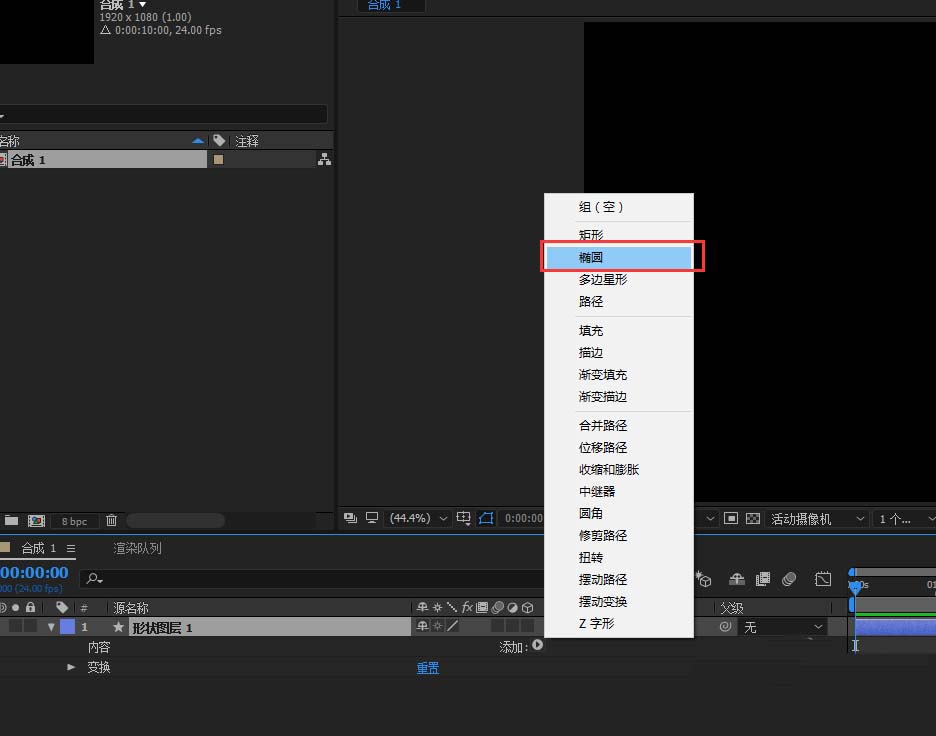 3、展開形狀圖層的效果,在內容中找到添加,點開添加選擇并單擊橢圓,來創建一個橢圓圖形出來。