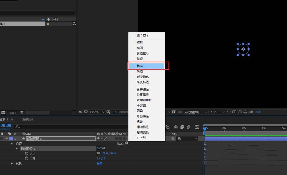 4、上一步創建的橢圓是無填充的,所以我們再次點開添加,在添加中找到“填充”,單擊填充為當前的圓設置一個填充顏色。