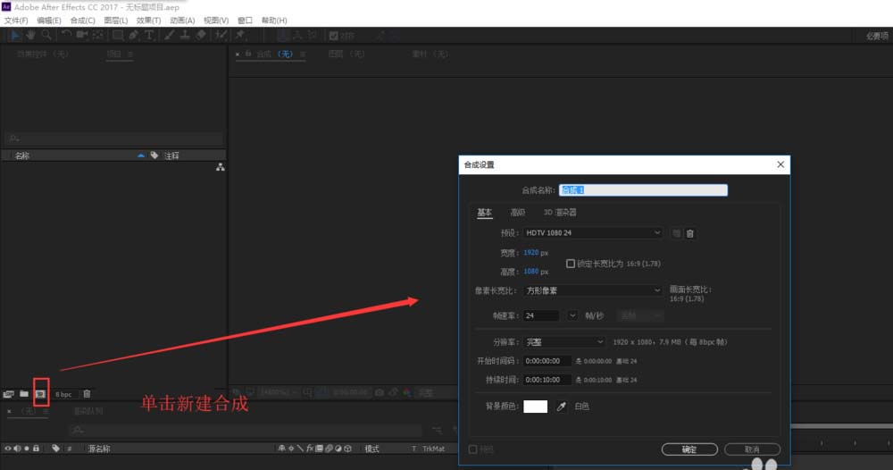 1、打開AE軟件之后先新建一個項目,然后在新建的AE項目的項目窗口找到新建合成按鈕,單擊新建合成按鈕來創建一個AE合成。