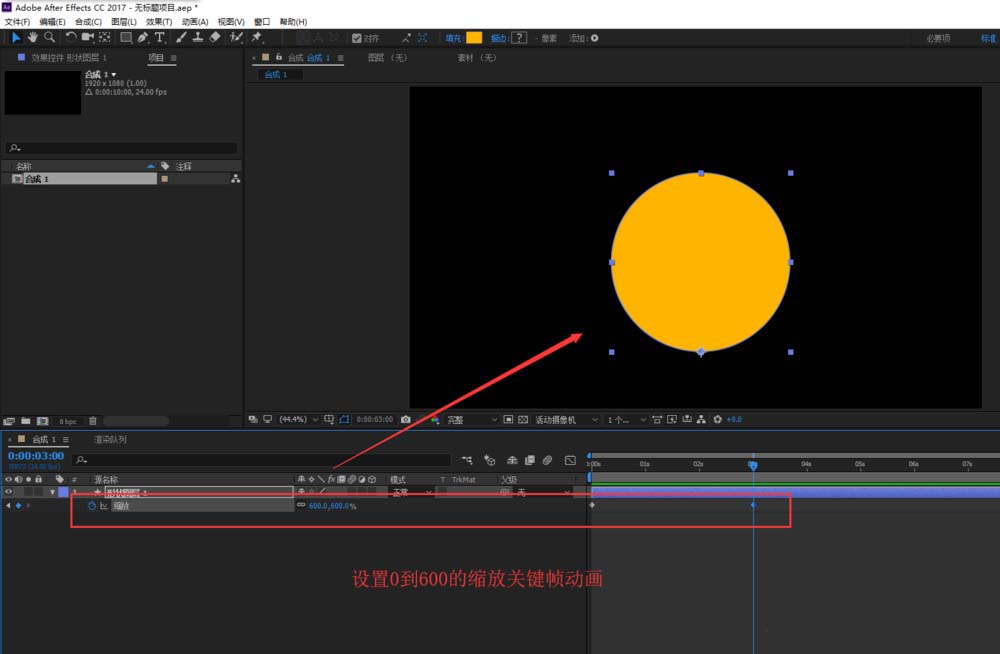 6、選中圖層按S展開縮放動畫設置,在開始的時候打入第一個關鍵幀,設置縮放數值為0;然后隔3秒的時間,設置縮放為600%并生成第二個關鍵幀。播放預覽,一個從一點縮放出現的圓動畫就出現了。