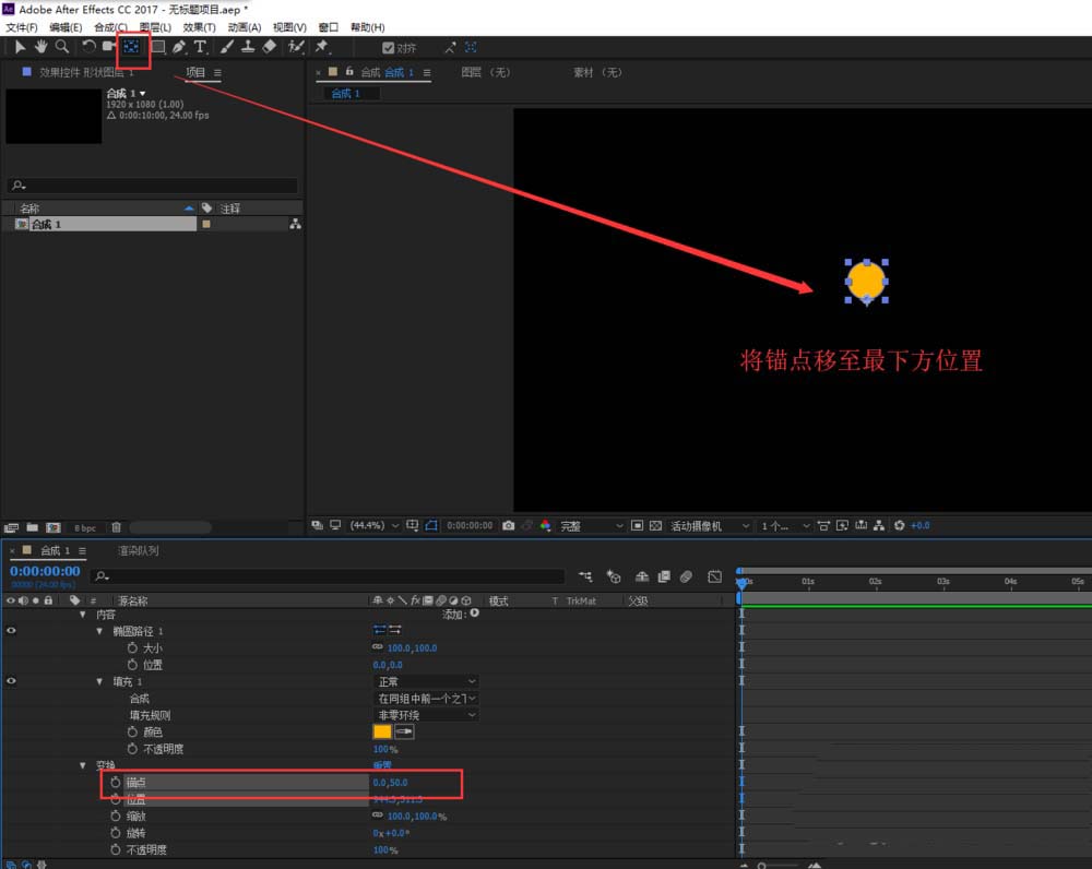 5、選中這個圓的圖形,找到“向后平移錨點工具”,將圓的錨點由中心點移動到圓圖形的最下方的位置上。