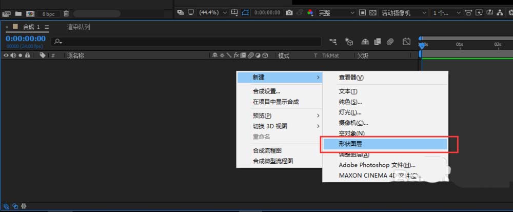 2、在該合成的圖層管理窗口處右鍵鼠標,彈出右鍵鼠標選項,選擇并執行新建中的形狀圖層,創建一個形狀圖層出來。