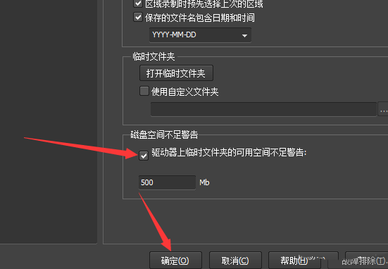 7、勾選上驅(qū)動(dòng)器上臨時(shí)文件夾的可用空間不足警告的選項(xiàng)。點(diǎn)擊 確定保存設(shè)置。