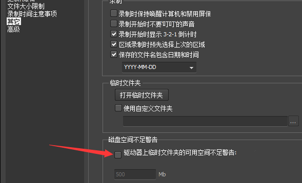 6、選中其它的選項(xiàng)之后,勾選上驅(qū)動(dòng)器上臨時(shí)文件夾的可用空間不足警告的選項(xiàng)。