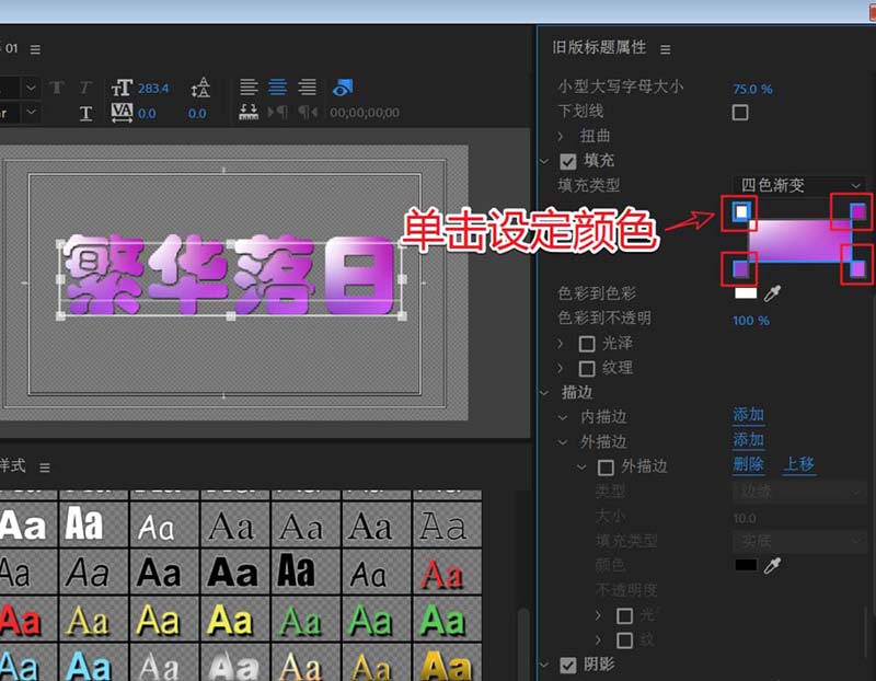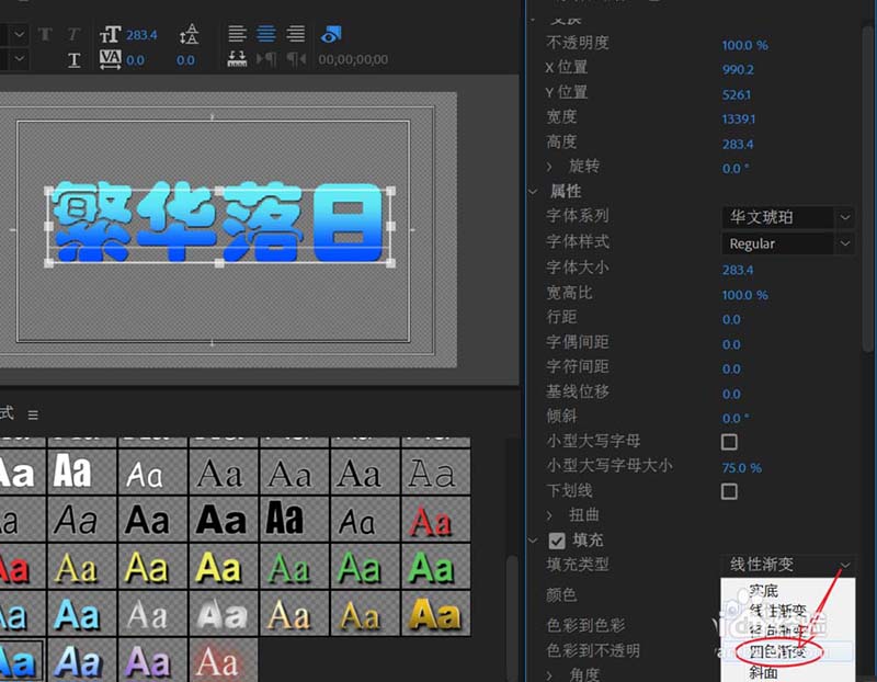 7、找到右側的舊標題屬性面板,將填充類型勾選并將其更改為:四色漸變。