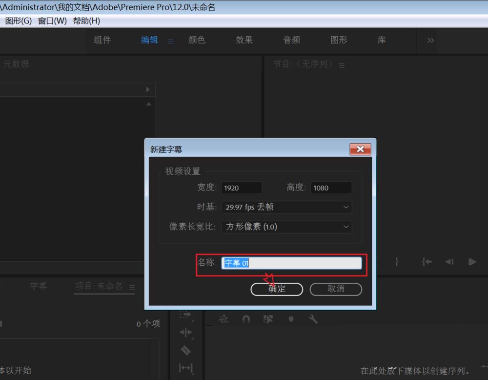 3、將視頻設置寬度設為:1920,高設為:1080,為新字幕起一個名稱。