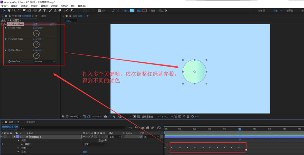 6、將時(shí)間軸移動(dòng)合適間隔,然后調(diào)整cc color offset紅綠藍(lán)的參數(shù),重復(fù)操作,得到多種顏色。播放時(shí)間軸,就會(huì)看到一個(gè)變色的小球動(dòng)畫就出現(xiàn)了。
