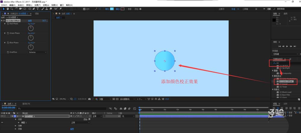 4、在效果與預(yù)設(shè)中搜索找到“cc color offset”這個(gè)效果,將這個(gè)效果施加到小球這個(gè)圓圖形上。