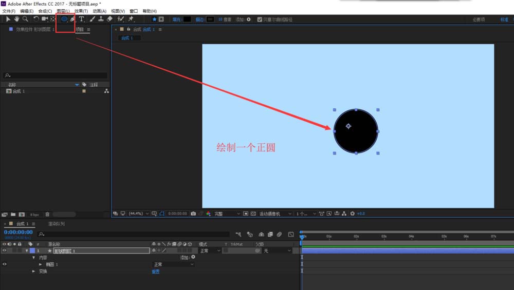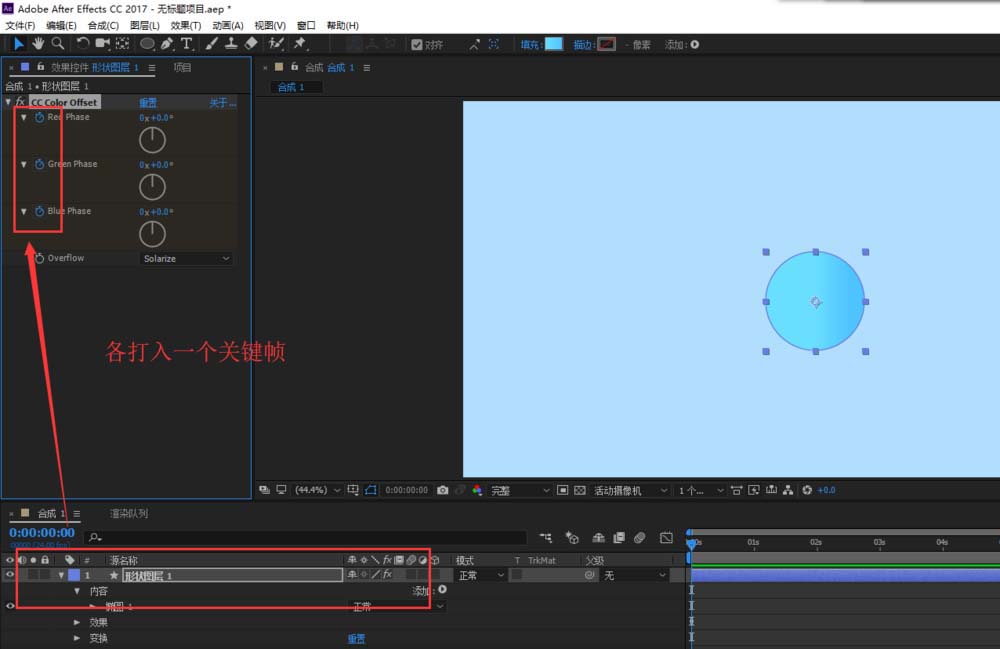 5、選中圓圖形圖層,打開效果控件窗口,在效果控件中在cc color offset效果的紅綠藍(lán)三個(gè)選項(xiàng)中都先打入一個(gè)關(guān)鍵幀。