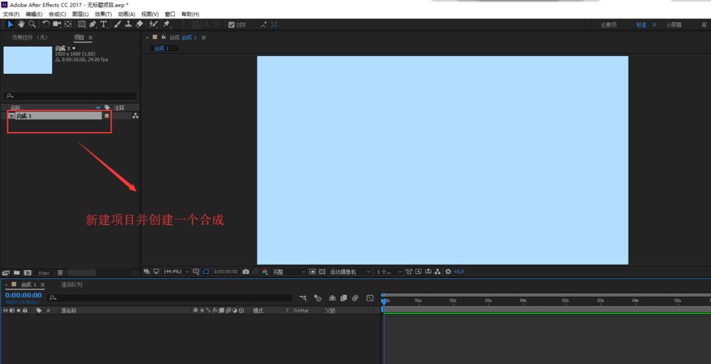 1、打開AE后期軟件,新建一個(gè)空白項(xiàng)目,并在項(xiàng)目中新建一個(gè)合成,設(shè)置好這個(gè)合成的必要參數(shù)。