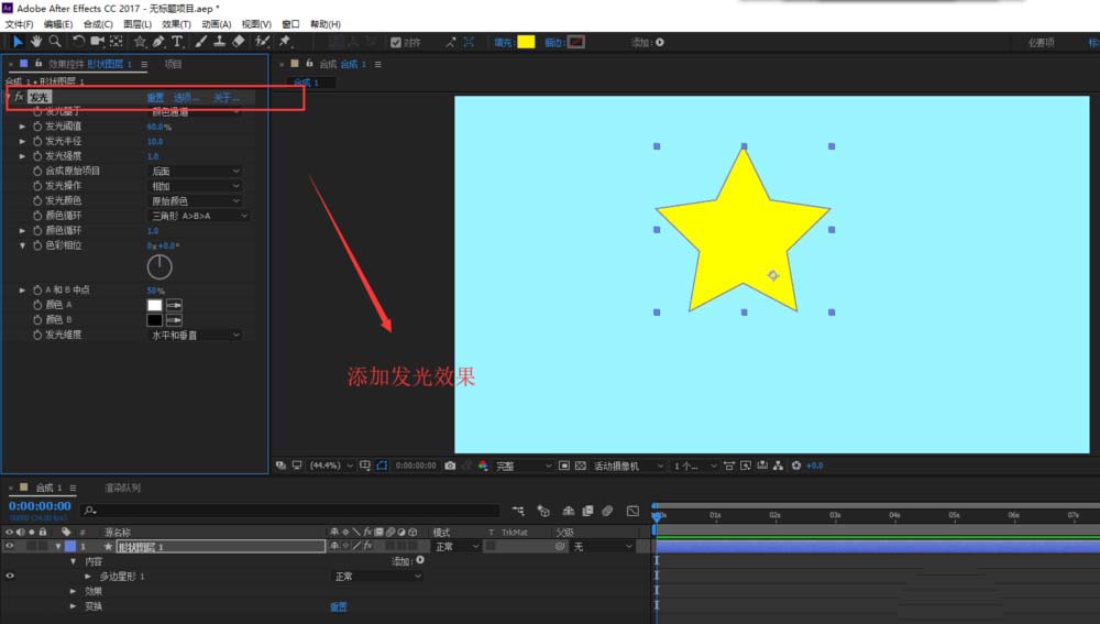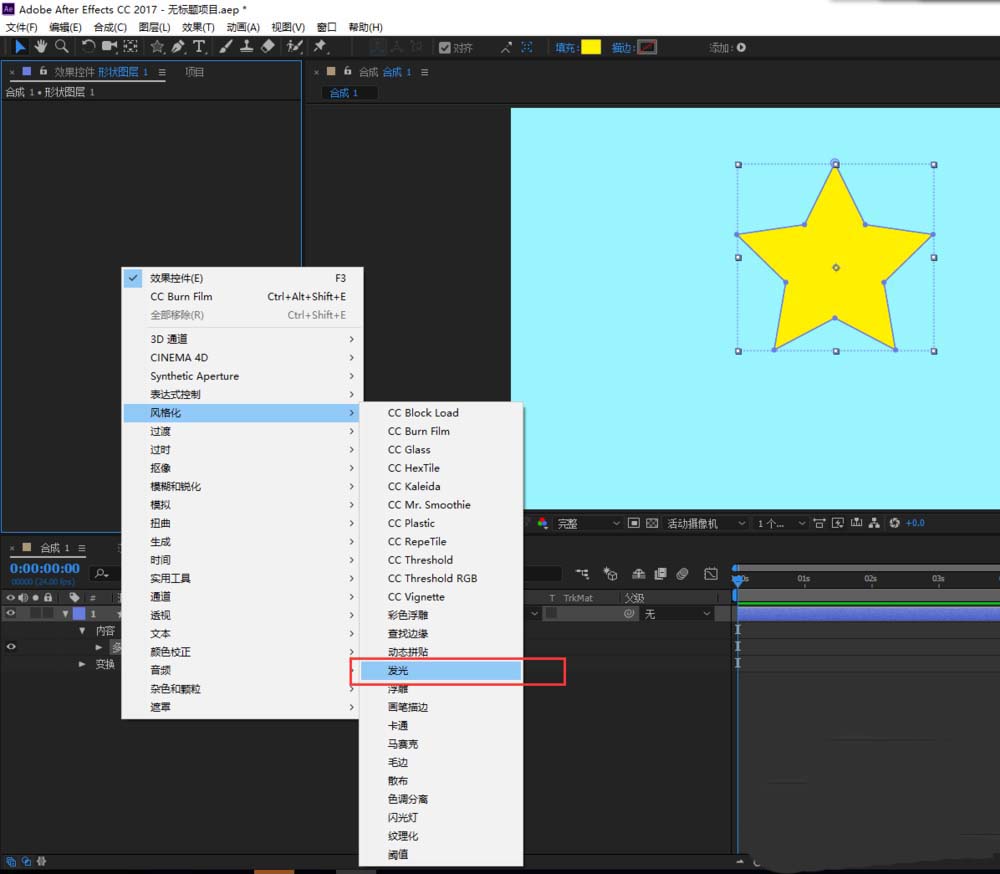 5、單擊右鍵找到的風格化中的發光效果,為五角星添加這個發光效果,現在這個發光效果還不明顯。我們接下來需要設置參數。