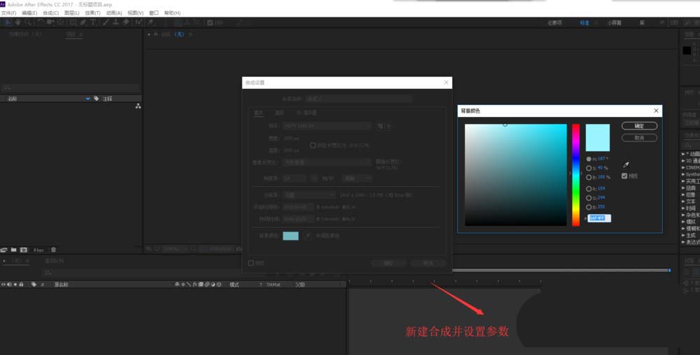 1、按Ctrl+N執行新建合成命令,打開合成設置窗口,在該合成設置窗口中設置合成的大小等屬性,并更改默認的合成背景顏色。