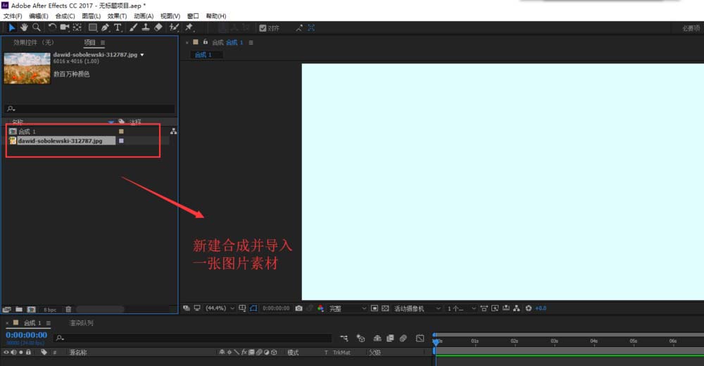 1、先在AE中要創建好一個合成,然后在這個合成中的項目窗口雙擊導入素材,將一張圖片素材導入進來。