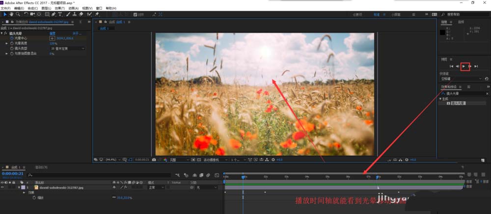 6、點擊播放按鈕,播放時間軸,就能看到一個鏡頭光暈從圖片左側運動到右側一個移動動畫效果了。